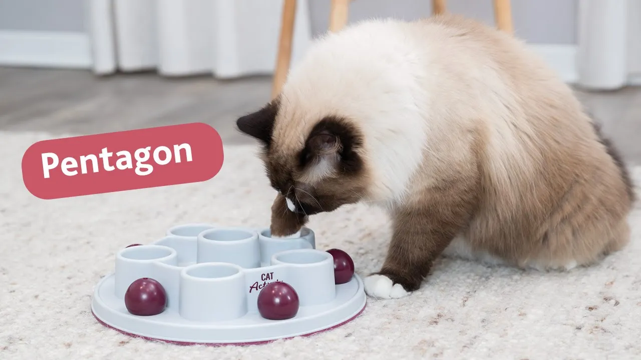 Развивающие игрушки предлагают кошке решить задачу и получить награду — угощение. Например, на доске раскладывают лакомства и закрывают их маленькими колпачками. Кошка должна опрокинуть колпачки и съесть угощение.