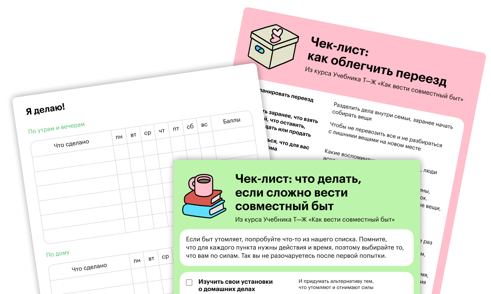 В трех текстовых уроках разберем основные практики и приемы, которые помогут разделить домашние дела с близкими и приучить детей заботиться о доме без конфликтов и ссор. Вы составите список обязанностей для каждого члена семьи и соберете собственную инструкцию по адаптации на новом месте.