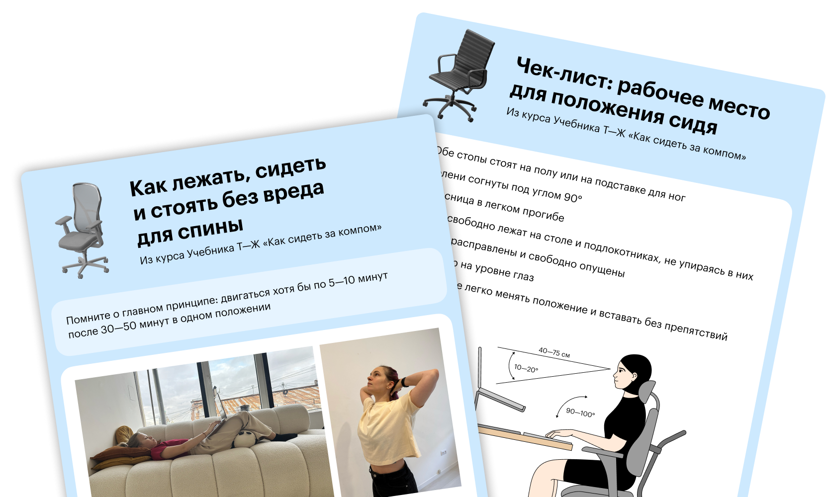 Последствия сидячего образа жизни можно свести к минимуму без огромных усилий — об этом наш бесплатный курс. Вы разберетесь, как обустроить удобное рабочее место, чтобы поддерживать осанку. Научитесь стоять, сидеть и даже лежать во время работы без вреда для здоровья. А еще освоите набор простых упражнений, чтобы расслабить и укрепить спину, если она уже напряжена.