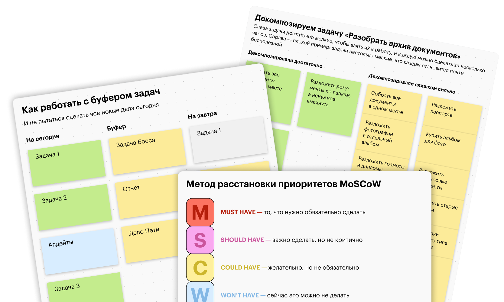 В основе курса — система организации дел. Она построена на проверенных принципах планирования, самоорганизации и управления временем. К этой системе можно подключить любые техники тайм-менеджмента, которые вам нравятся. О некоторых мы поговорим в курсе, другие — предлагаем искать, пробовать и встраивать в систему самостоятельно.