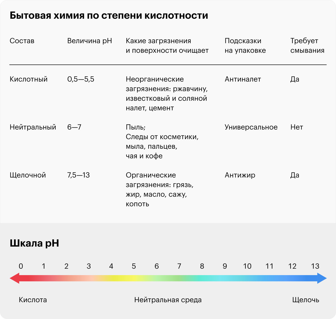 Обычно одним средством не обойтись: для разных загрязнений и поверхностей подходит химия с разным pH — показателем концентрации водорода. Уровень pH — лучший способ определить, какое средство вам подойдет.